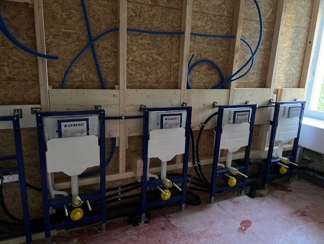 Eine Nasszelle im Obergeschoss wird komplett saniert. Eine zweite Nasszelle wird zurück gebaut. Alte Leitungen müssen wasserlos und nach den Richtlinien “für Hygiene in Trinkwasserinstallationen” ausgeführt werden.